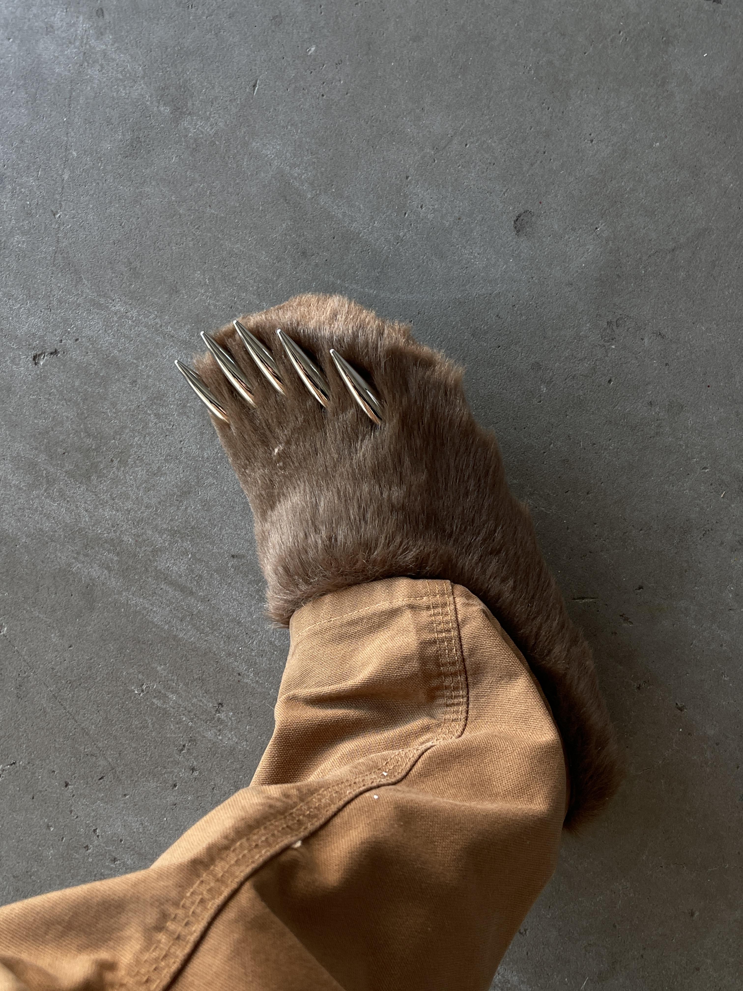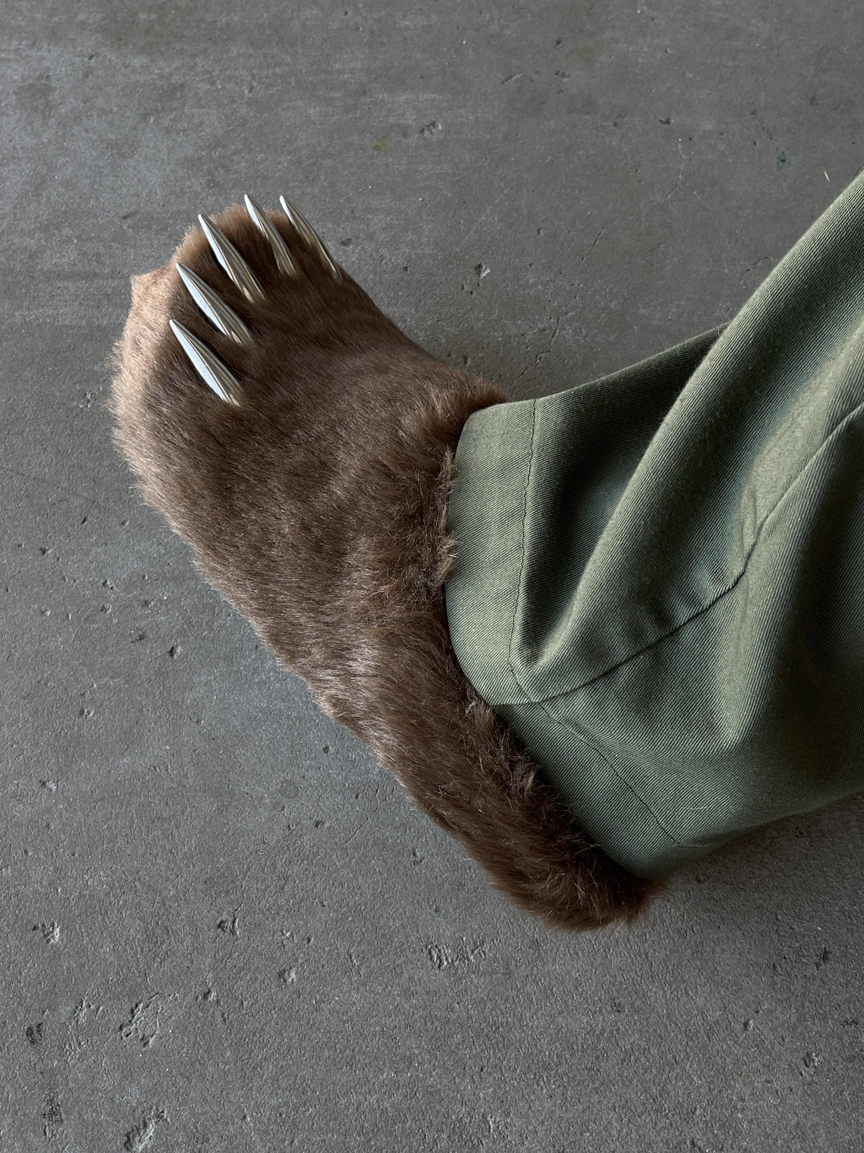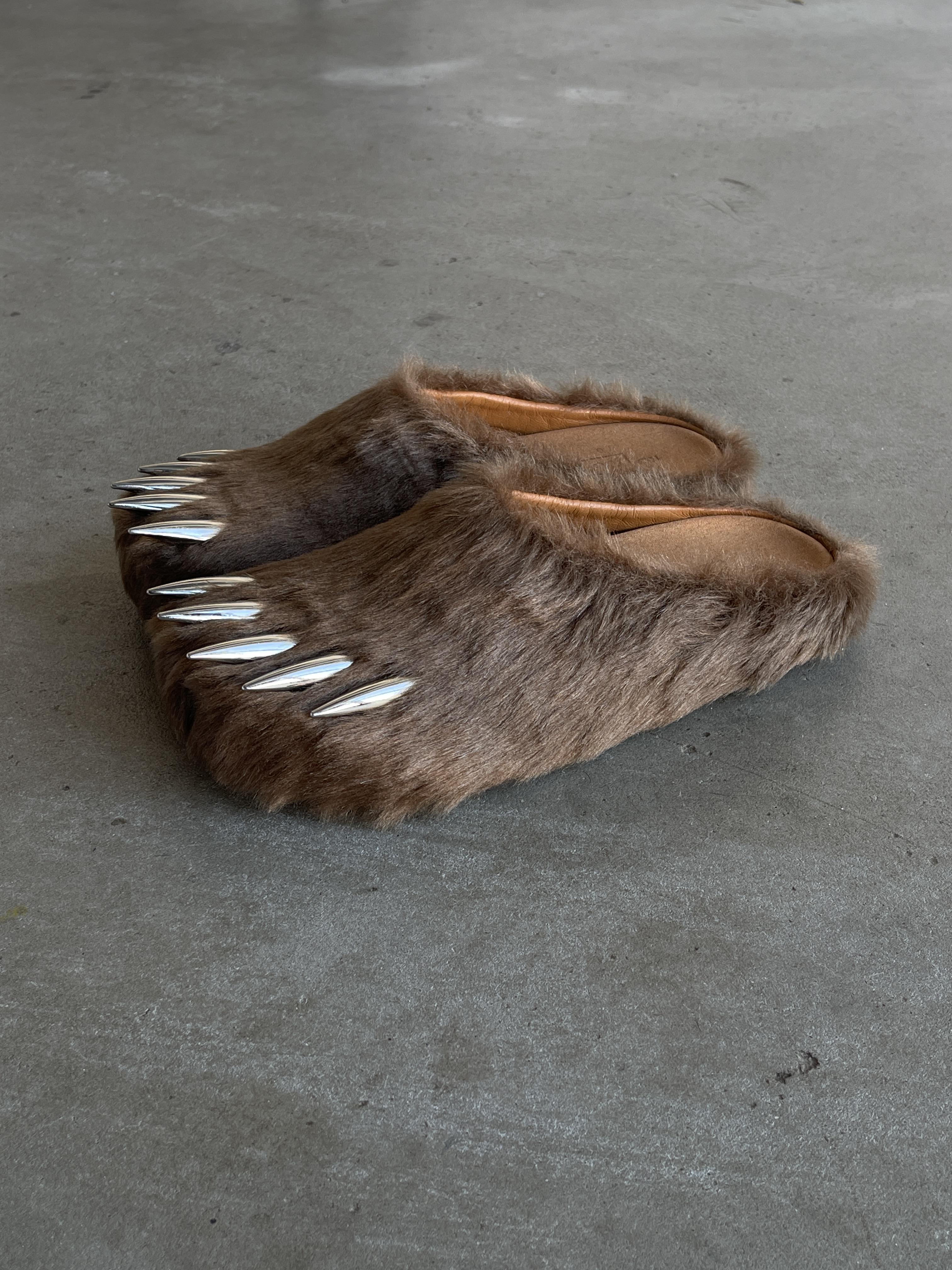 The 'Bear Claws' mules boast an upper completely enveloped in brown calf hair, giving them a distinctive and untamed appearance. The defining feature of this peculiar pair is the metallic bear-like nails that protrude from the toe box, a design choice that takes the concept of "claws" quite literally. Subtle Bravest Studios branding is imprinted in crisp white on the footbed, serving as a reminder of the audacious minds behind this creation.