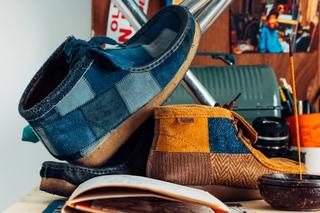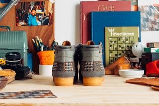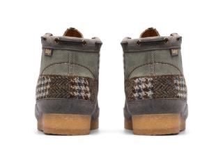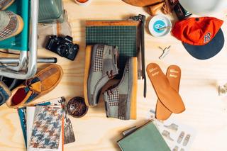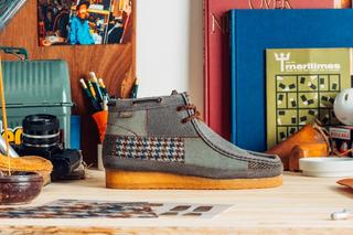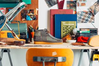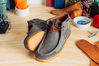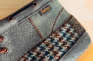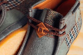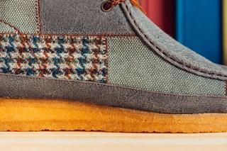 The design features a patchwork construction of duck canvas, colorful tweeds, and weathered leather, each material chosen for its significance in shaping the aesthetic and livelihood of New Englanders over generations. The mix of fabrics reflects the garments worn by laborers, students, and everyday people, giving the Wallabee a uniquely rugged yet refined feel.