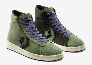 The Chuck Taylor comes in a collection of colors and materials, utilizing a patchwork-like construction that alternates between shaggy mustard suedes, olive canvas, royal nylon, and black mesh, with a neutral mesh tongue completing the mix. The pair is capped off with classic off-white sole units, red laces, silver hardware, and multi-colored BHM embroidered logos. Dr. J’s Pro Leather arrives with no leather — except on the liners — again opting for shaggy suede and textile. This time, though, it utilizes tonal olives paired with sail sole units, vibrant purple laces, and chrome heel panels.