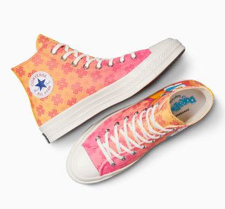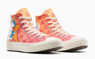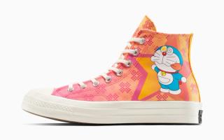 Headlining the capsule are two standout sneakers: the Chuck 70 and the All-Star, both decked out in vibrant Doraemon-themed prints. The Chuck 70 features an orange-pink gradient upper adorned with digital pixel-like patterns and a large Doraemon graphic at the heel. Meanwhile, the All-Star opts for a crisp white base layered with a repeating print of the blue feline in various animated expressions and poses.