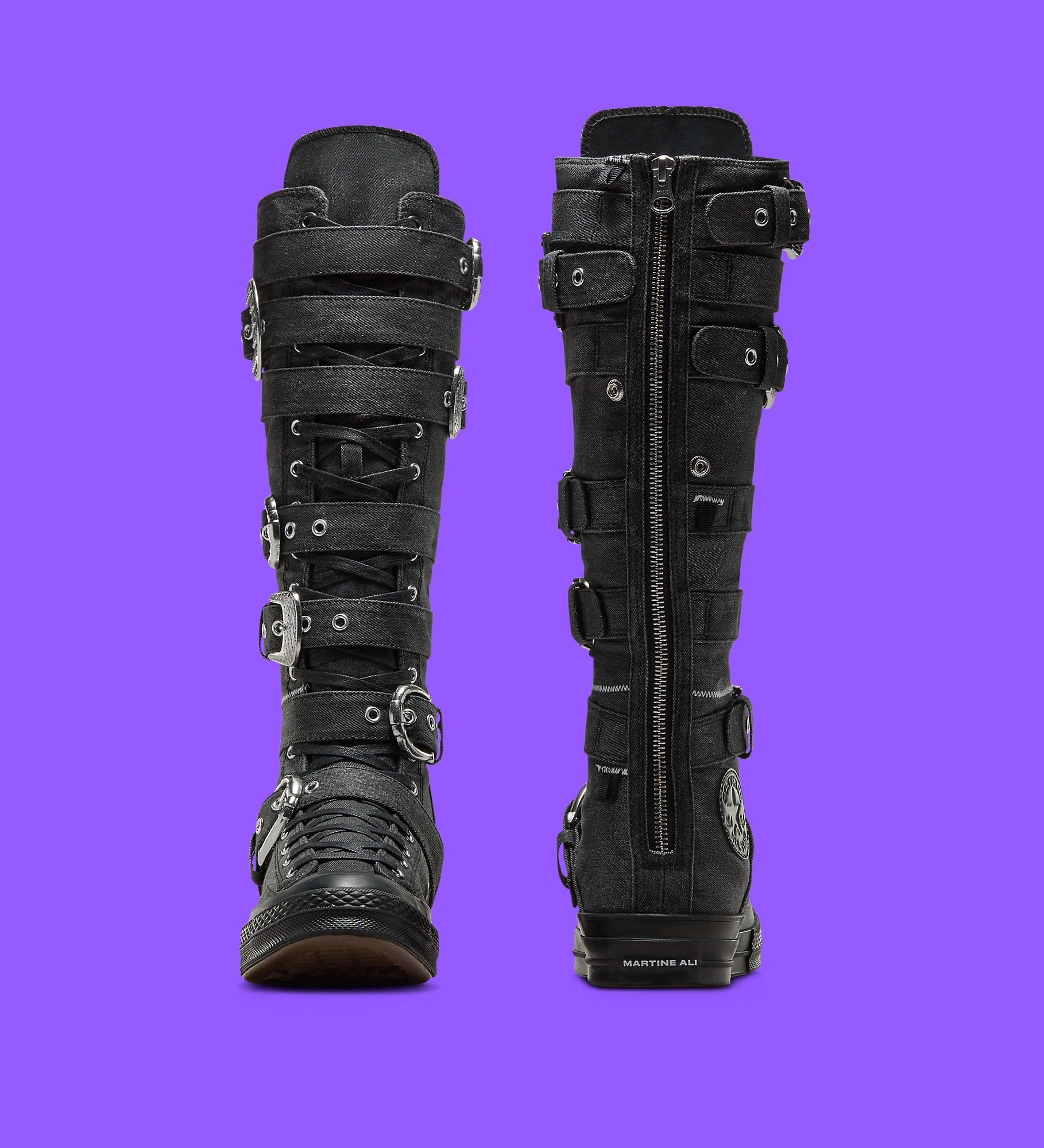 Brooklyn-based designer Martine Ali, known for her distinctive approach to jewelry that emphasizes individuality and uniqueness, extends her creative vision to footwear in her latest collaboration with Converse. This partnership breathes new life into the iconic Chuck 70, reimagining the beloved silhouette in a manner that's both bold and nostalgic. Ali transforms the classic premium high-top into an audacious knee-high style, drawing inspiration from the original Converse XXHi of the early 2000s. This capsule collection stands as a testament to the timeless appeal of Converse, infused with Ali's unique aesthetic that blends contemporary design with Y2K nostalgia.