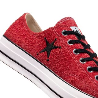 Replacing the familiar 8-Ball imagery, this collaboration embraces Stussy's playful jester-like star motif, which adorns each pair, adding a unique touch that distinguishes these Chucks from their predecessors. The design strips back the traditional Chuck Taylor ankle patch for a more minimalist, faceless badge, allowing the shoes' vivid colors and textures to take center stage.