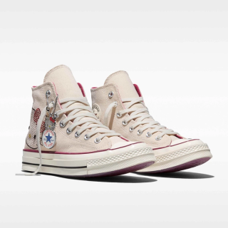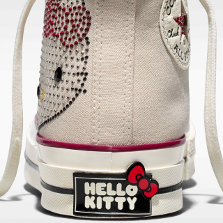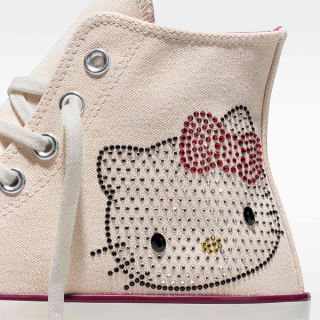 The reimagined high-top maintains some of its most emblematic design details intact, opting for a light cream-colored canvas across the top-half. This base sets the stage for large Hello Kitty® motifs on the lateral heel, done in eye-catching Swarovski® crystals. The similar light-manipulating adornments take on classic Converse logos on the medial profile, breathing new life into the decades-old design.