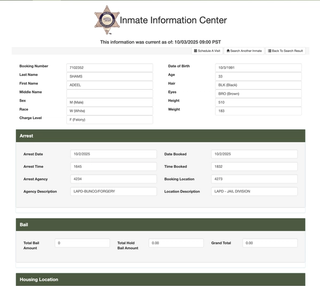 According to the Los Angeles County Inmate Information Center, Shams, 33, was booked on Thursday, Oct. 2, by the LAPD’s BUNCO/Forgery Division on felony charges related to alleged fraud. The arrest took place around 4:45 p.m. local time, with booking logged at 6:32 p.m. the same evening. Jail records indicate no bail was set, and he was released early on Friday, Oct. 3 on own recognizance (OR) pending trial.