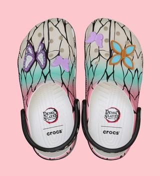 Named after the beloved Insect Hashira, the clog draws design inspiration from Shinobu’s distinctive haori — a soft, pastel gradient from cream to teal to pink, overlaid with vein-like black butterfly wing patterns. Purple, orange, and blue Jibbitz charms echo her gentle demeanor and role as a poison wielder, while Demon Slayer insignia is stamped on both the insole and heel strap for official authenticity.