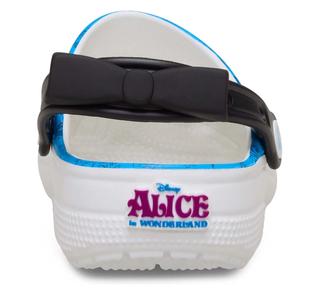 The pair dedicated to Alice features a blue Croslite™ upper accented with a contrasting all-over pattern. Graphics depict the protagonist alongside floral and other symbols seen throughout the Disney film. Heel straps are included in the thematic makeover via a detachable black bow, which references Alice's hair bow. A call out to the movie appears as a "license plate."
