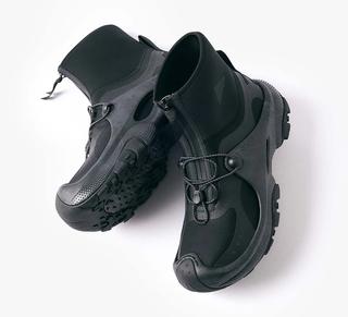 END. Clothing's Crocs Trailbreak features a tall, zippered collar, neoprene and water-resitant materials, a speed-toggle lacing system, and protective, exaggerated tooling for reliable traction. Branding from the trio appears throughout the boot's upper.