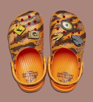 Pictured here in children’s sizing, this striking edition features a reptilian skin-like print in tiger-striped orange and brown, mimicking the iconic T-Rex’s scaly hide. A vivid “Safety Orange” base provides high contrast, flooding the footbed, outsole, and interior lining. Custom Jurassic-themed Jibbitz charms include a glaring dino eye, claw, crate, and caution signs, while the lateral side features molded Jurassic World branding.
