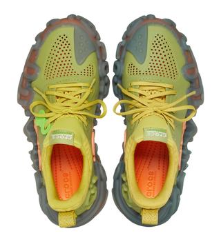 The "Sudd" features an avocado-green leather upper, evoking a rich, organic tone, complemented by a mustard yellow inner bootie for a vibrant contrast. The shoe’s design is further enhanced by peach-colored caging at the midfoot, which wraps around the underlays, offering a dynamic twist. However, the translucent sea green sole sets this pair apart. It is designed with a signature fingerprint-inspired pattern, adding an additional layer of texture and style.
