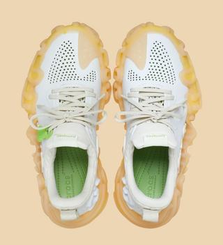 The Crocs Juniper first made waves with the "Guava" colorway, characterized by its vibrant pink and green hues, followed by the "Tree Camo" version with its bold print. The "Tahini," however, opts for a more subdued aesthetic. It features a clean, all-white upper that extends from the breathable TPU heel to the foxing panel. This minimalist approach is contrasted subtly by an earthy translucent gum underfoot, continuing the theme of nature that Bembury often explores in his designs.