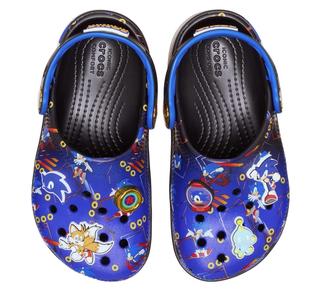 Developed and launched by Sega in 1991, Sonic has gone on to be more than a simple video game title. Crocs' collaborative Classic Clog, however, draws inspiration from the virtual platform, depicting the titular character in a vibrant setting that could very well be a video game level. Rings and other elements from the world of Sonic the Hedgehog appear across the Croslite™ upper and sip-resistant tooling; traditional branding on the heel strap's hinge is replaced with a golden ring. Jibbitz™ charms shaped as Sonic, Tails, and recognizable items from the game round out the special pair.