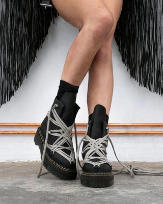 Unveiled through campaign visuals shot by Owens himself and starring Sissy Misfit, the collection includes three different styles of Quad Boots: Steel Toe, 1B60 Pentalace, and 1460 Megalace. Each option features Dr. Marten's signature platform sole unit and is finished with extended geometric tongues, easy zippers on the medial side, and a special edition AirWair pull tab on the spine. Unorthodox lacing appears across the trio, continuing a conversation established in past collections by Rick Owens for Dr. Martens.