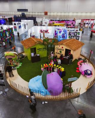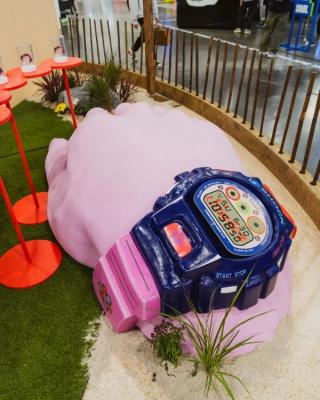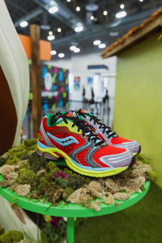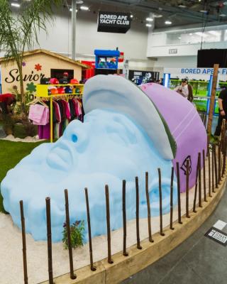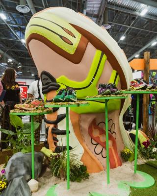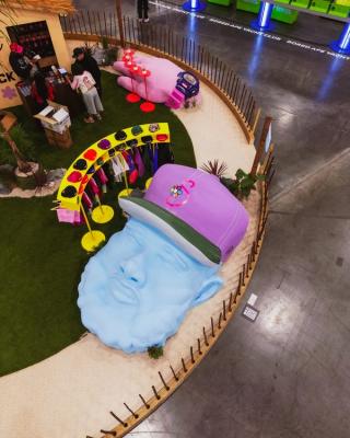Designed by Larry Tchogninou and James Langford of Points of Sail, with fabrication by Cover Everything, the booth transformed into a surreal desert island inspired by the buried sculptures of Easter Island. The concept reimagined Tips himself as a colossal figure emerging from the sand, with each visible body part symbolizing a different partnership: a massive head for Savior Worldwide apparel and New Era hats, a giant hand sporting the ComplexCon-exclusive G-Shock watch, and an oversized Saucony Triumph 4 “Poison Ivy” sneaker anchoring the setup.