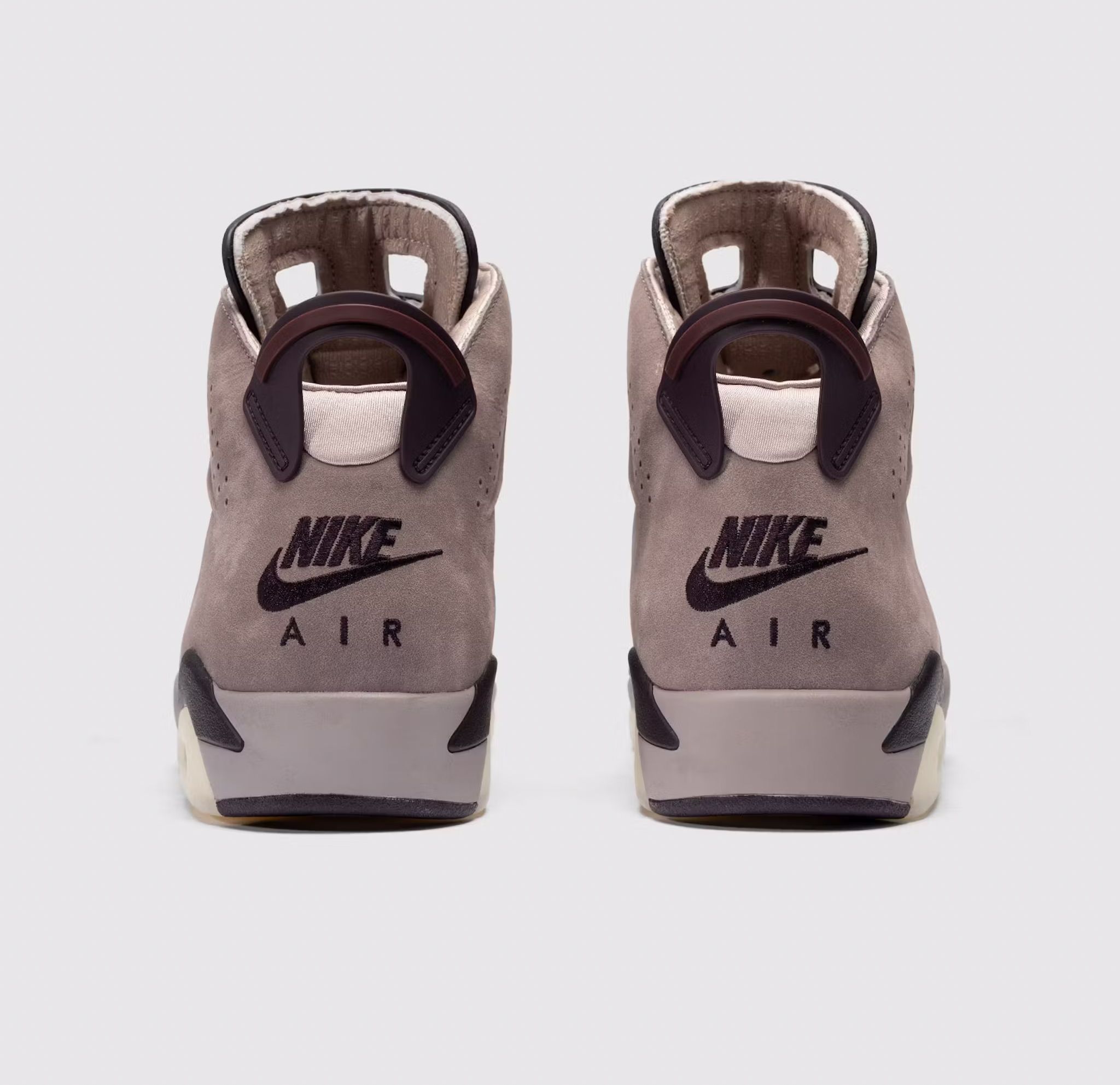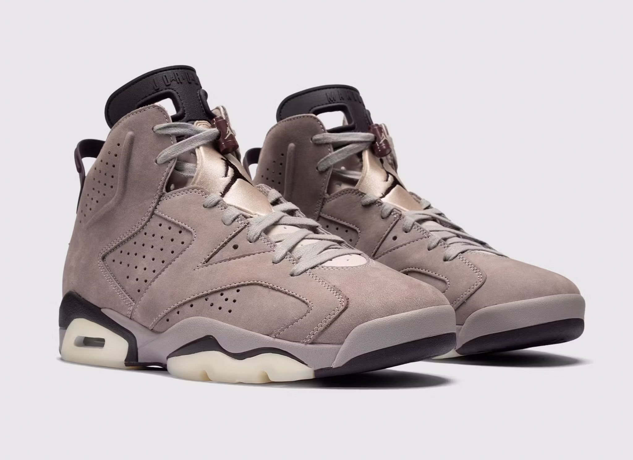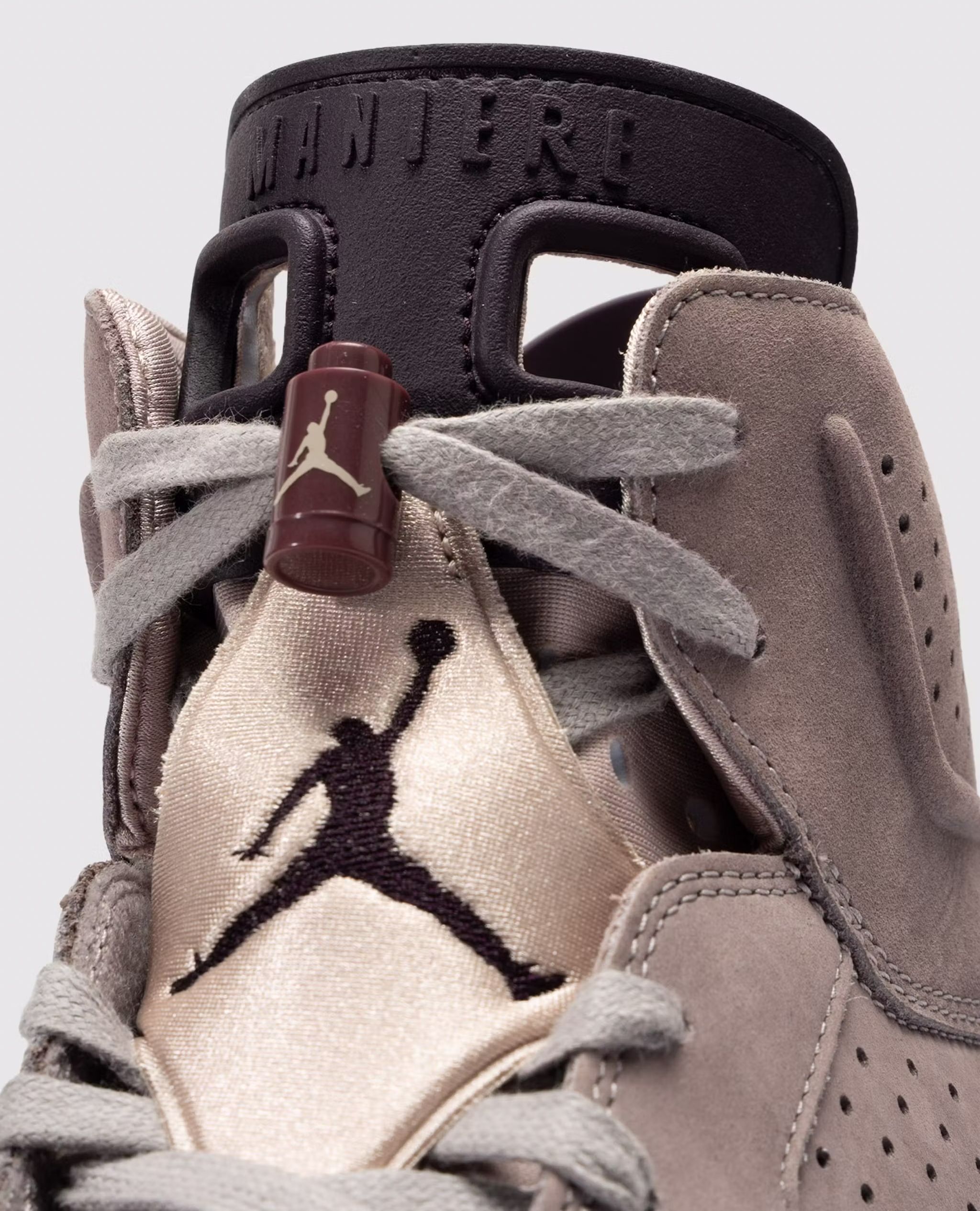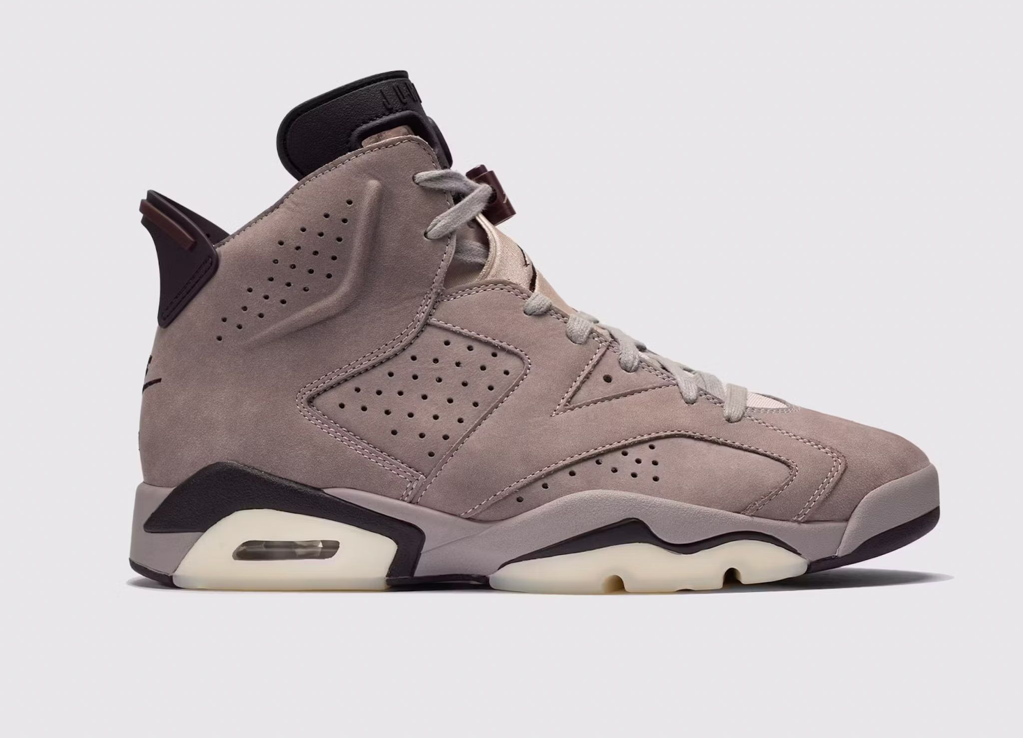 This upcoming pair is dressed in muted taupe nubuck across the upper, delivering a soft yet structured feel. The monochromatic base is accented by darker hits on the heel tab and midsole, while the lace toggle and heel spoiler add subtle contrast. Perforations along the panels and collar retain the AJ6’s original performance roots, while co-branded insoles mark the collaboration.