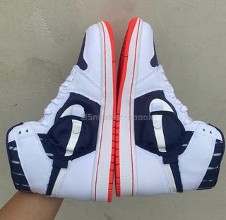 Continuing the themes set before it from the Air Jordan 7 and the like, the collection’s Air Jordan 1 Stash is again delivered in a twist on the tricolor, with white and navy canvas uppers peppered with bright crimson accents. Here, it’s blue uppers that host white overlays and nylon tongues, with laces and midsoles following suit. Pops of crimson cover the co-branded tongue tags, outsole and midsole stitching, with pack-specific pinstripes at the collar rounding out the design.