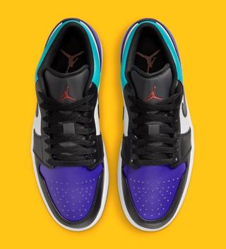 Staying true to the spirit of the Air Jordan 1 Mid, the low-top variant features white leather uppers, black nylon tongues, a dash of purple at the heel locks, and teal accents gracing the collars. However, it deviates from its predecessor by swapping out the white toe box with an extension of the daring purple hue, thus amplifying its overall visual impact.