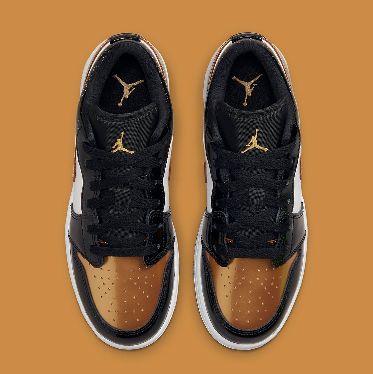 Though the pair closely resembles a handful of Air Jordan 1 Highs and Mids from over the years, this new release swaps a typical gold finish for copper, whilst typical blacks and whites remain. Here, it’s white leather. Mid panels and black patent overlays and collars_ the latter speckled with gold glitter — before shiny copper metallics are layered at the toe and Swoosh overlays. Branding at the tongue and heel mimic this, with white midsoles and gold-flecked rubber outsoles rounding out the design.