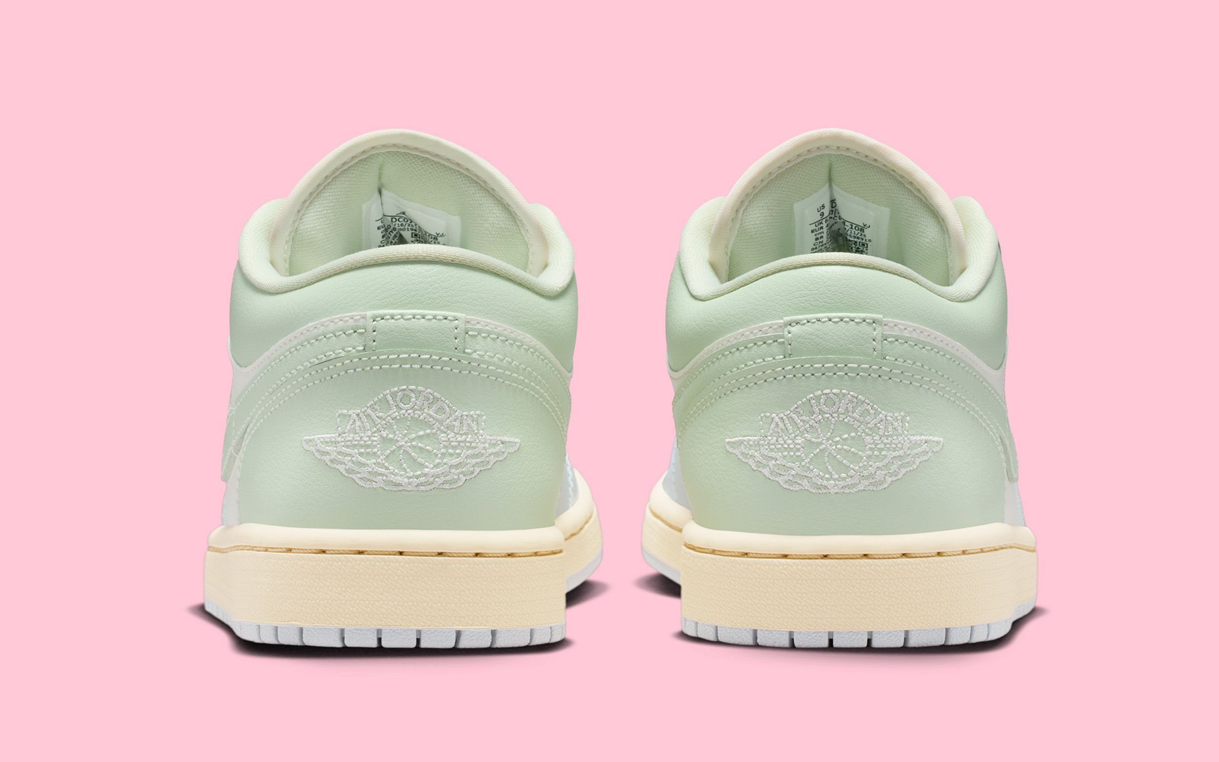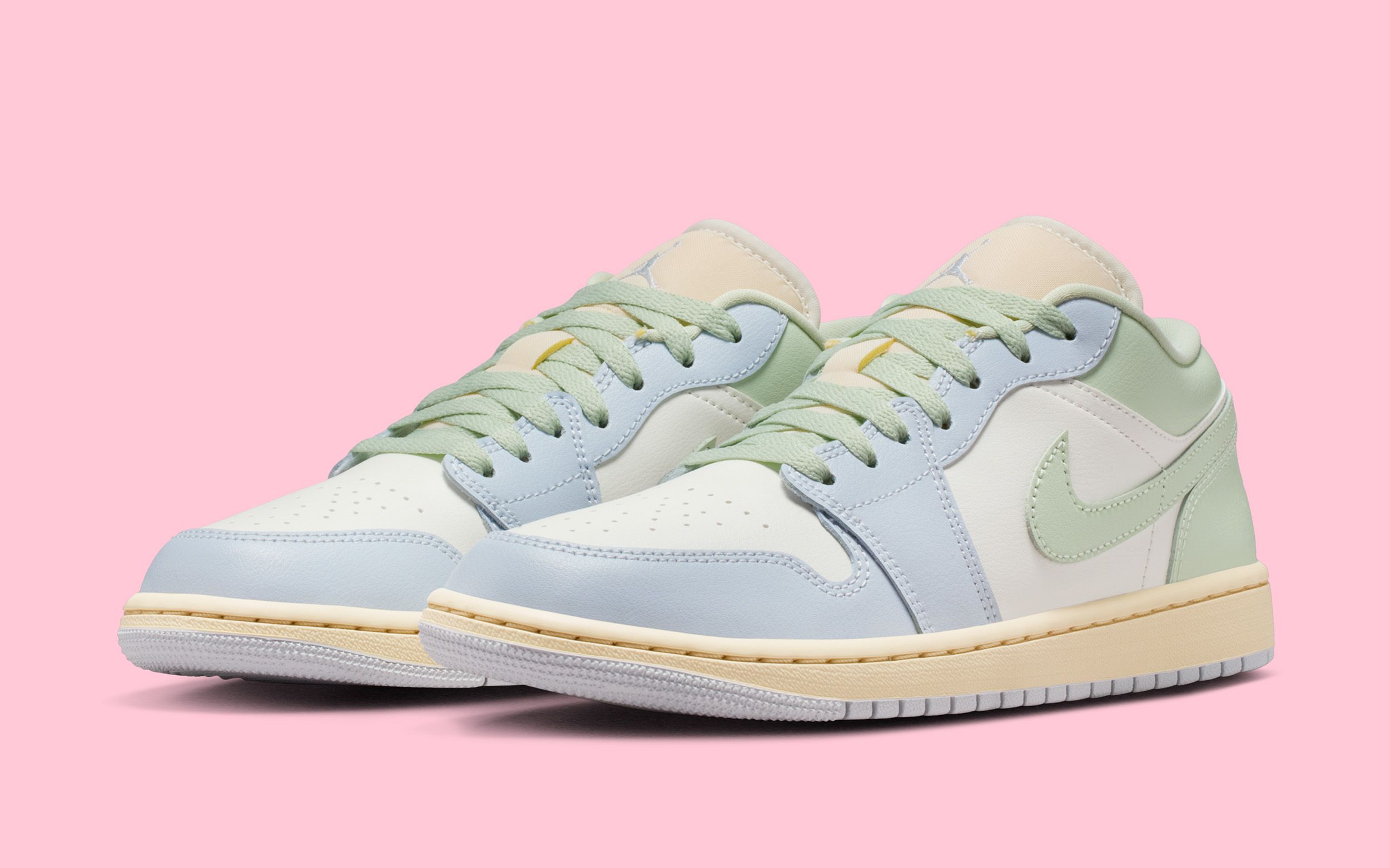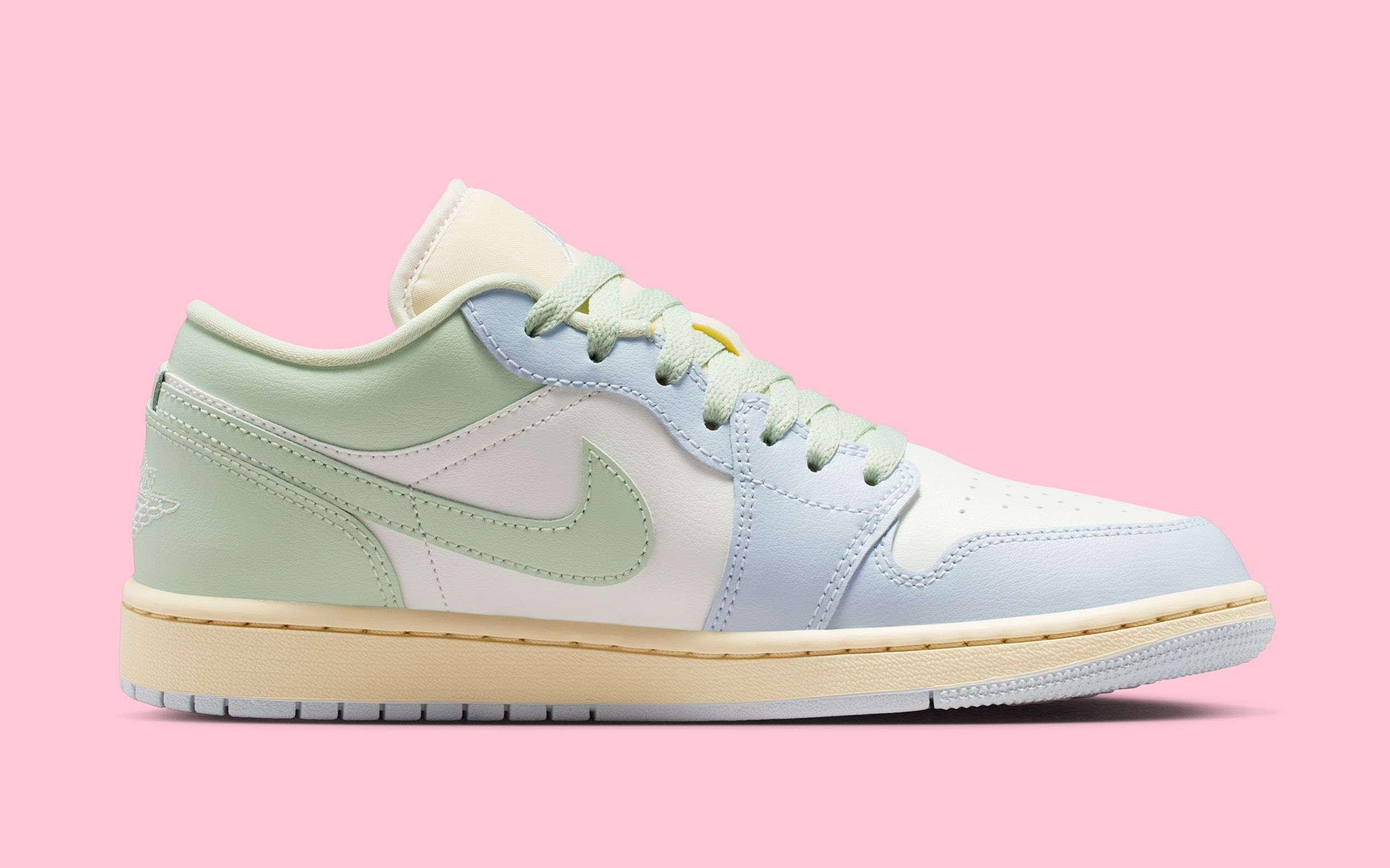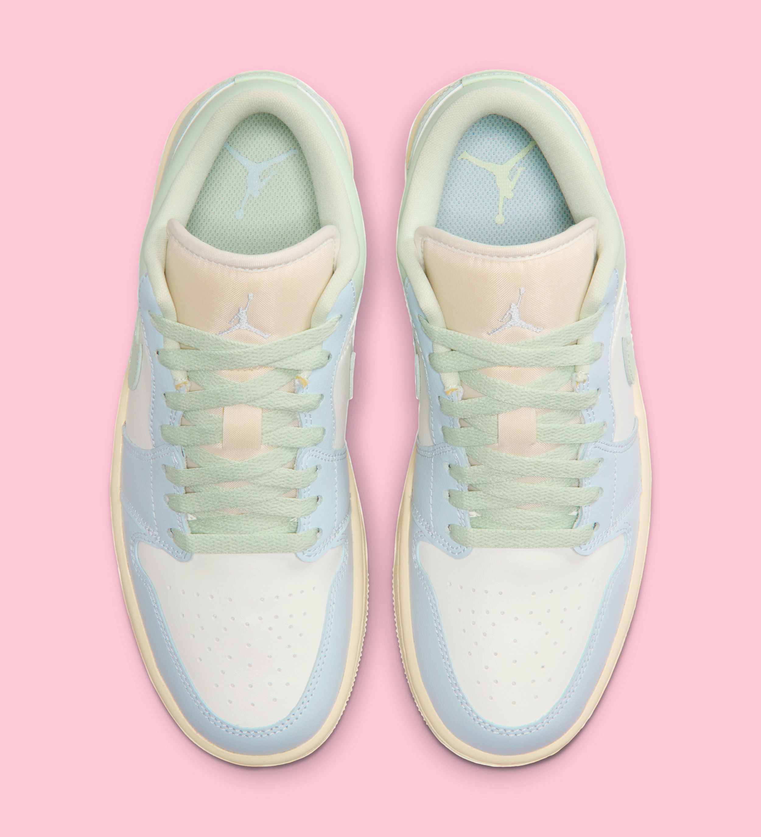 The pair arrives in a blend of white leather and muted pastels, combining Jade Aura green, light blue, and cream across the upper. Panels shift from icy blue overlays to washed-green Swooshes and heel counters, while a cream-tinted midsole adds subtle vintage warmth without leaning too heavily into an aged aesthetic. The shoe’s smooth white toebox keeps things grounded in classic Jordan 1 Low DNA, while the two-tone pastel laces tie the color story together.