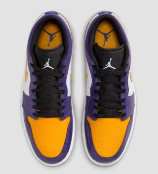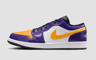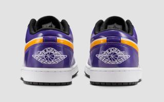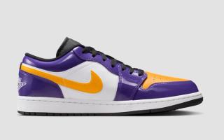 Recently, Peter Moore's iconic design emerged in a "Court Purple/White/Black/University Gold" color scheme. The retro features glossy patent leather panels across the upper, differentiating it from the pack. The purple-and-gold-heavy execution evokes images of the Los Angeles Lakers' colors, which have also landed on a special Air Jordan 4 expected to drop by NBA All-Star Weekend. The shorter silhouette, then, could also have been developed to commemorate one of basketball's most important franchises of all-time.