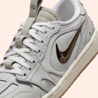 The upper comes constructed in smooth Summit White leather with cutout-inspired paneling that gives the shoe its deconstructed look. Metallic accents stand out across the design, most notably with the polished metallic Swoosh and matching Wings logo at the heel. The tongue introduces a textured finish, adding depth to the neutral build, while white laces and lining maintain balance throughout.