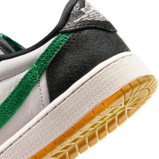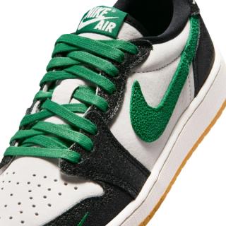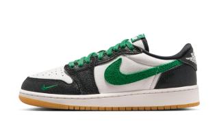 The Air Jordan 1 Low OG “Phantom & Pine Green” pairs soft, off-white leather uppers with textured black overlays, giving the base a bit more depth than your standard smooth build. From there, Pine Green cuts through the design via the oversized Swoosh, laces, and branding, bringing a sharp contrast that keeps the palette from feeling flat. A gum outsole underfoot rounds things out, adding a subtle vintage touch that ties everything together.