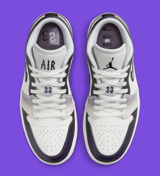 At its core, the "Punk Rock" edition features a foundational palette of white, black, and purple, a color scheme that could easily find itself at home on the stage of a punk venue or in the pages of a zine from the era. However, the addition of metallic silver croc-skin detailing on the heel and quarter panel sets this pair apart, adding a layer of punk's characteristic flamboyance and flair for the dramatic.