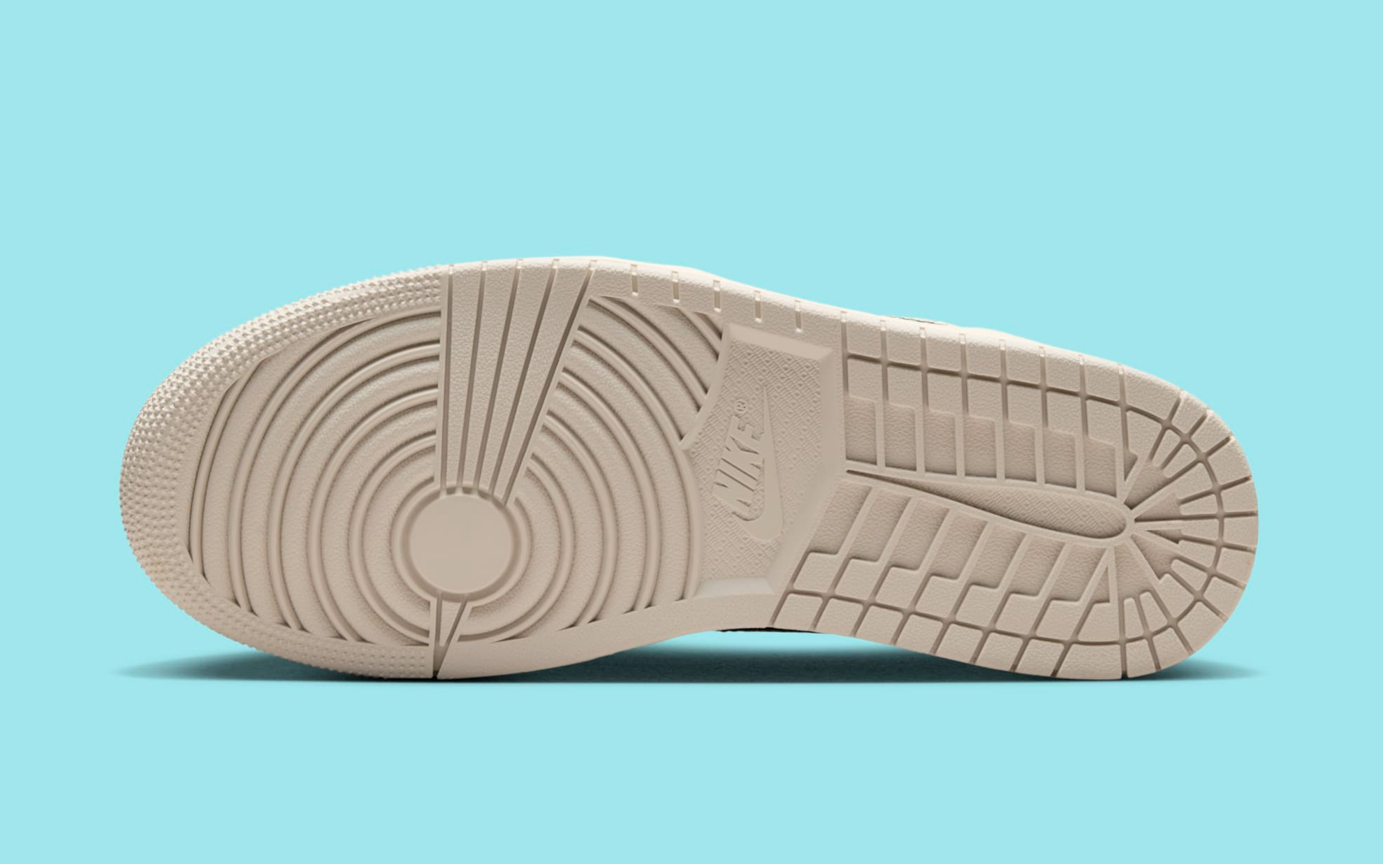 The "Sanddrift" colorway offers a subtle yet impactful look, featuring a light, earthy base that makes the black Nike Swoosh stand out prominently. This contrast is further enhanced by glacier blue accents, which appear on the Jordan logo on the heel and the tongue/sock liner lining, injecting a cool tone that complements the overall warmth of the sneaker.