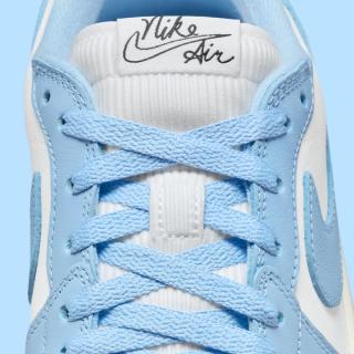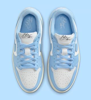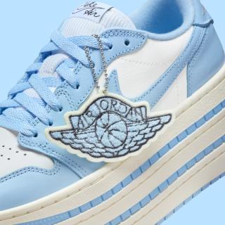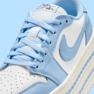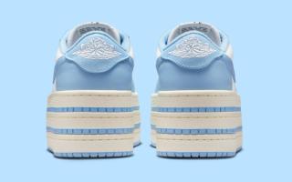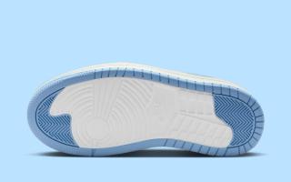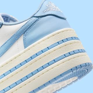 The upper remains rooted in familiar territory, keeping the Air Jordan 1 Low’s classic paneling intact. Smooth white leather sets the stage, paired with soft Psychic Blue overlays across the mudguard, eye stays, heel, and Swoosh. The pastel finish tempers the silhouette’s exaggerated proportions, offering a clean and airy counterbalance to the dramatic build beneath.
