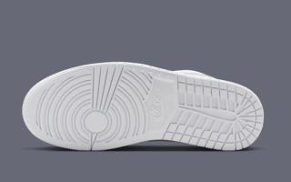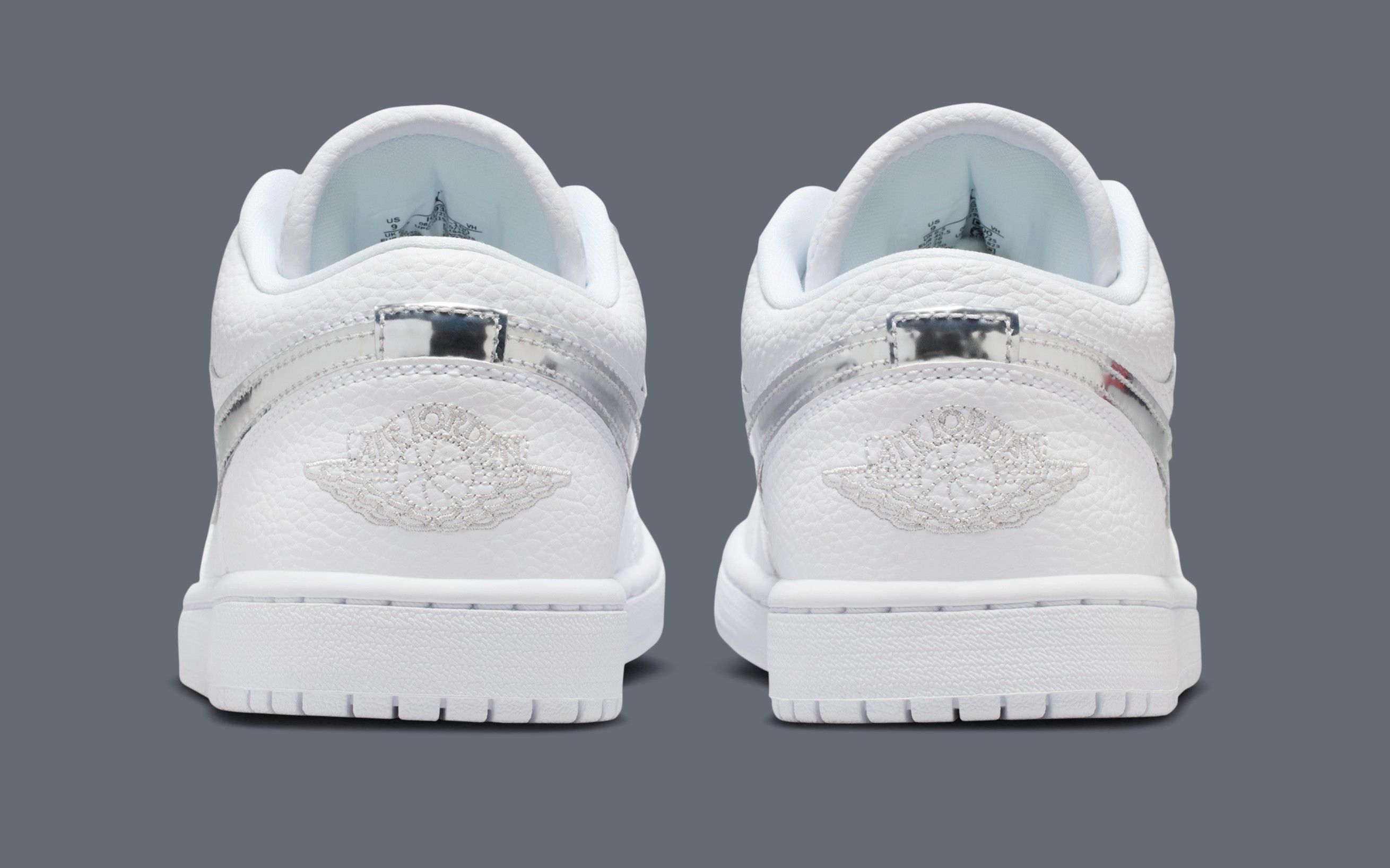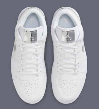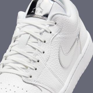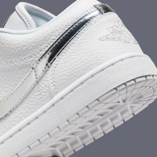 The upper arrives in crisp white tumbled leather, giving the shoe a soft texture that elevates the familiar Jordan 1 Low shape without drifting into luxury-for-luxury’s-sake territory. The real point of interest comes by way of the Swoosh, finished in a reflective Metallic Silver that adds just enough edge without overpowering the clean base. It’s a restrained accent, but one that catches light in motion and gives the shoe a sharper visual identity than a standard white-on-white offering.