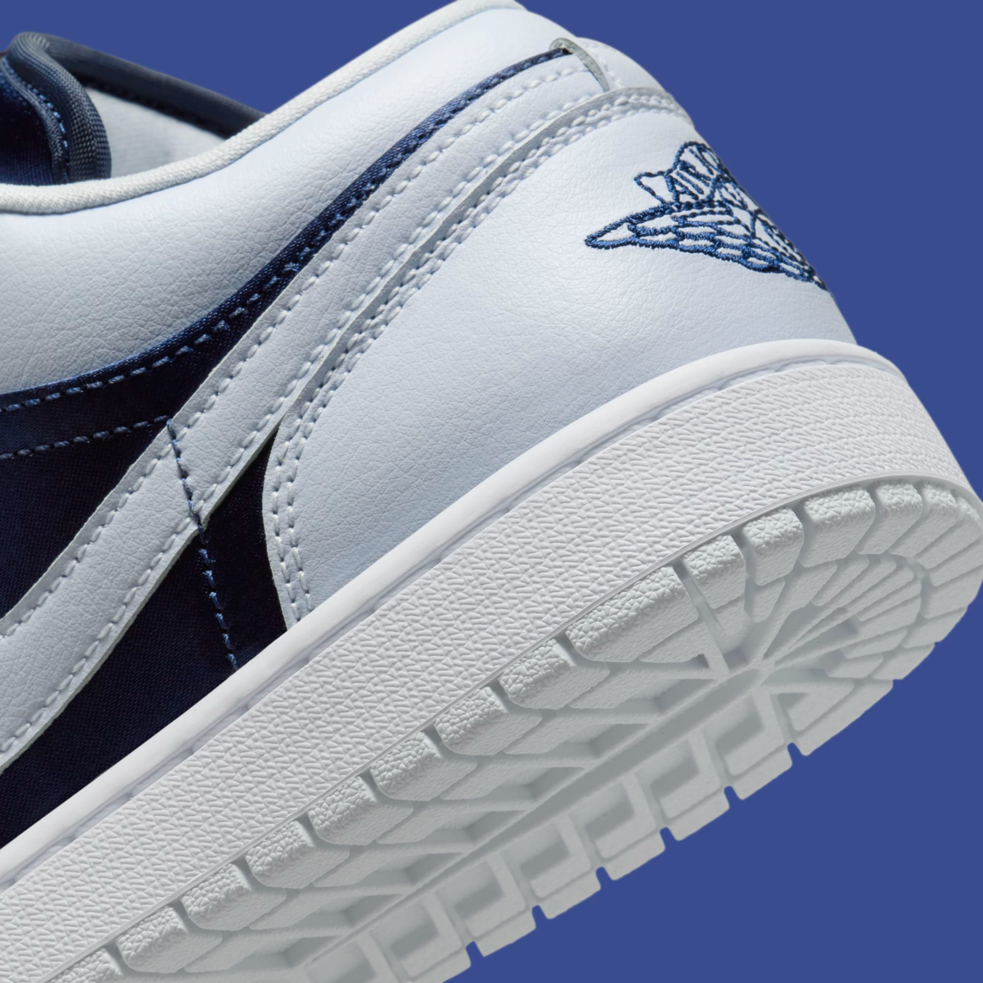 The "Football Grey" features a dark blue denim and satin upper, providing a sophisticated texture that complements the clean white paneling. The design is further elevated by a chenille Jordan logo on the tongue, adding a unique and tactile detail.