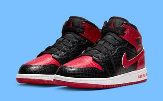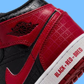 Here, the pair certainly earns the title; It’s a carbon copy of the original blocking and construction, with smooth black and red leather uppers, black nylon tongues, and red tongue branding — though the latter sits as a Jumpman to remain in line with the Mid’s design mantra. Here, though, the pair is highlighted by an all-over gloss print that reads “BLACK” and “RED” on each respective leather panel. Furthermore, the nickname is highlighted on the midsole, with “BLACK + RED = BRED” printed onto the lateral side to complete the design.