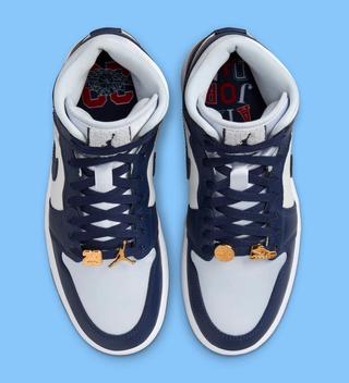 Underfoot, a dual-tone sole unit in white and navy grounds the design, maintaining a clean and classic aesthetic. Chenille branding on the tongue tags further enhances the luxurious feel, adding a plush element to the sneaker's texture. Like the low version, this Mid also features a collection of gold lace charms that add a striking bling factor, making it a standout accessory and footwear.