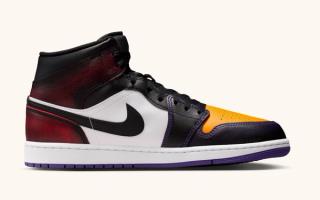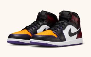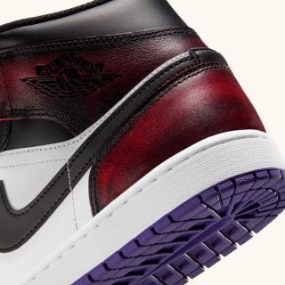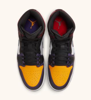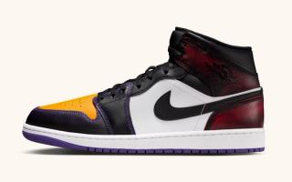 Officially clad in a "True Red/White/Court Purple/Black" color scheme, the pair features a faded presentation around the ankle and lower heel. The finish bears resemblance to the skateboarding-inspired pair from six years ago, which signaled the Air Jordan retro's fade-away uppers. Purple-and-gold components appear throughout the forefoot, referencing the Los Angeles Lakers' iconic colors. As with its predecessor, the special AJ1 Mid nods to the importance of LA and Chicago in the worlds of sport and culture.
