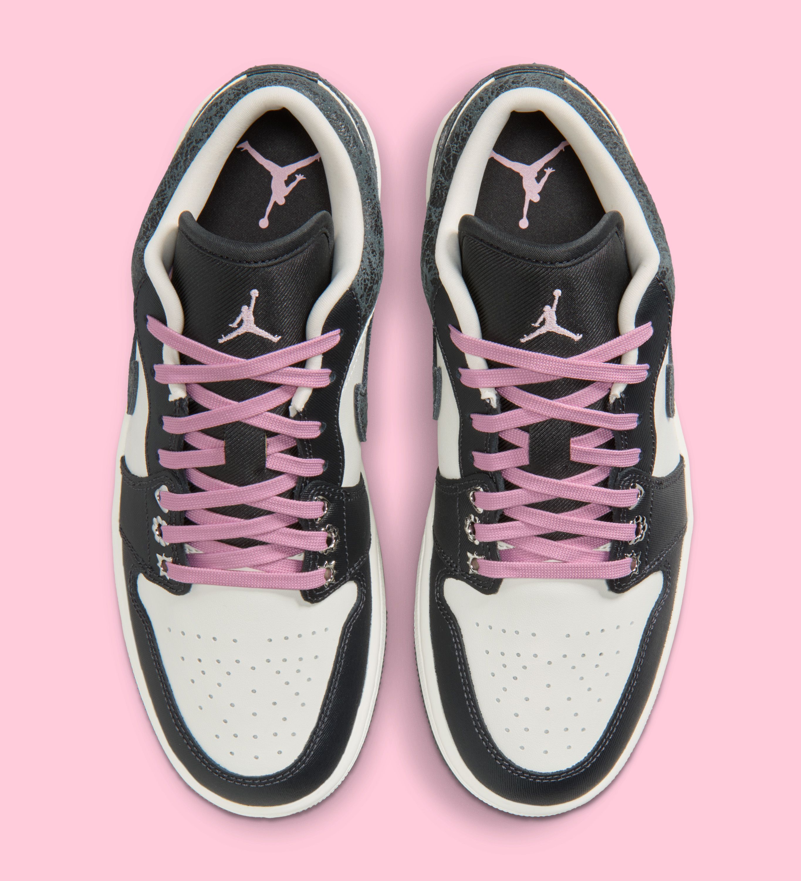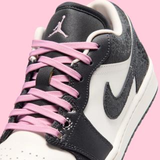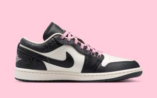 The Air Jordan 1 Low, takes a slightly subtler approach. While it maintains the same iced pink and dark upper blocking, its chrome detailing is concentrated along the lower eyestays and hardware. Pink laces and Jumpman branding on the tongue further reinforce the theme, delivering a cohesive two-shoe pack that feels curated rather than repetitive.