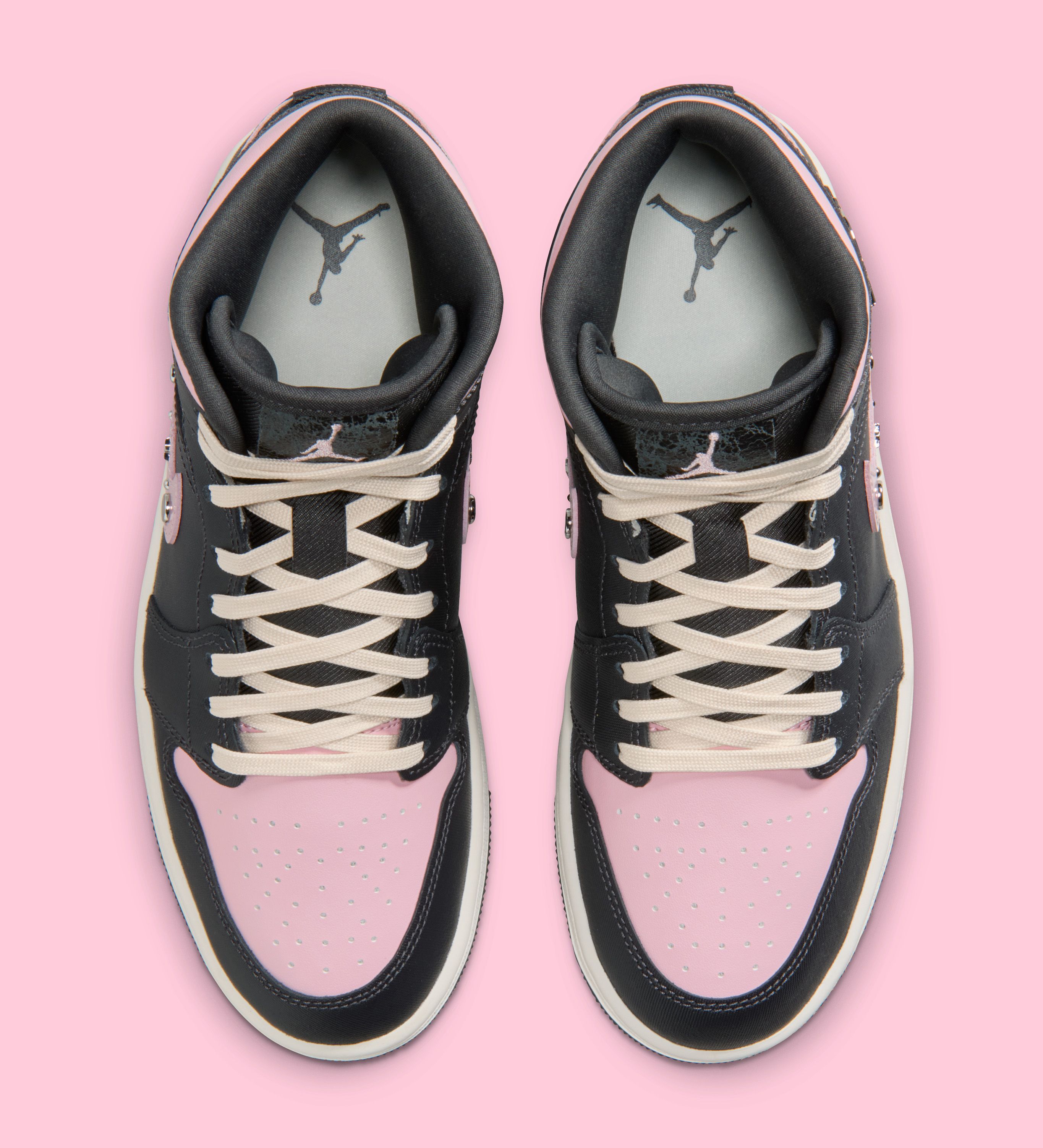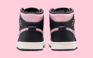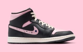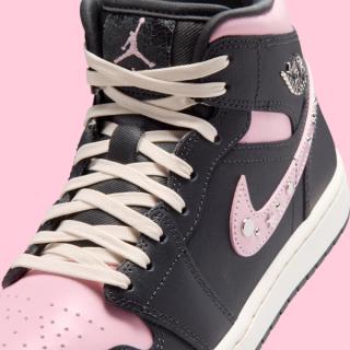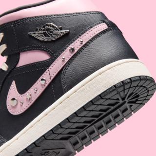 Across both silhouettes, a mix of muted black and off-white panels creates a neutral base, allowing the icy carmine pink accents to take center stage. The Air Jordan 1 Mid in the Air Jordan 1 "Iced Carmine" Collection stands out with glossy chrome hits on the Swoosh overlays and the Wings logo at the ankle. Metallic studs and star-shaped embellishments line the pink Swoosh, adding texture and dimension without overwhelming the classic Jordan 1 structure.