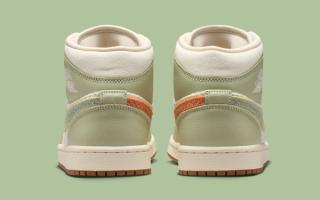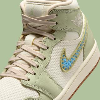 The Air Jordan 1 “Olive Aura” Woven Collection spans both Mid and Low builds, each dressed in a soft, nature-inspired palette that feels equally at home in early spring or late fall. A woven textile base replaces traditional smooth leather underlays, giving the panels a tactile, basket-like finish that immediately sets the pack apart. Overlays arrive in muted Olive Aura leather, wrapping the toe, eyestays, and heel with a calm, earthy tone.