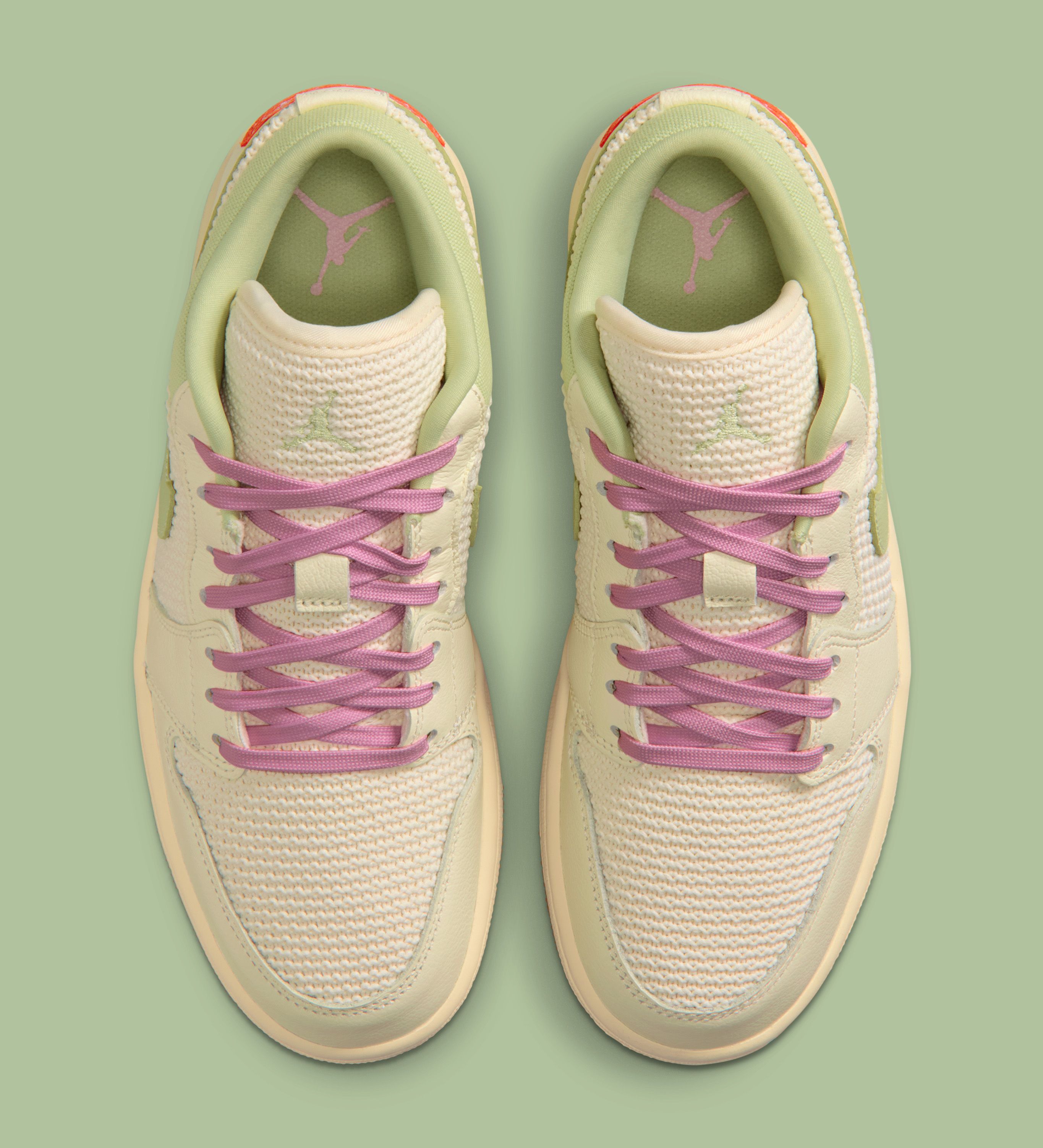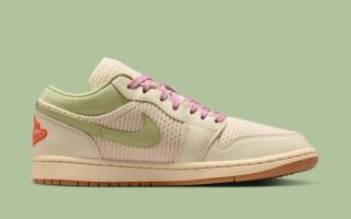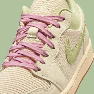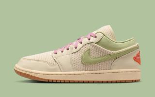 The Low opts for a more understated execution, pairing a cream mesh-like base with Olive Aura Swooshes and heel tabs. Pink laces on select pairs add a subtle seasonal lift, while embroidered Wings logos at the heel provide a bright finishing touch.