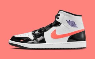 The upper is anchored by a clean white leather base, providing a neutral foundation for the shoe’s bolder accents. Black patent leather overlays wrap the toe, eyestays, and heel, adding a glossy finish that sharpens the overall look and introduces a premium edge to the Mid-cut silhouette.