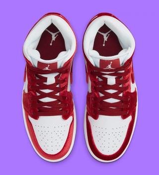 The Air Jordan 1 Mid "Red Velvet" features a classic white leather and nylon construction, providing a crisp, clean backdrop that enhances the vibrant red velour overlays. This luxurious touch adds a tactile dimension and nods to the shoe’s OG color blocking. Color-matched laces, tongue branding, and the iconic Wings logo on the ankle further unify the design, while a simple white and red sole maintains the sneaker’s classic roots.