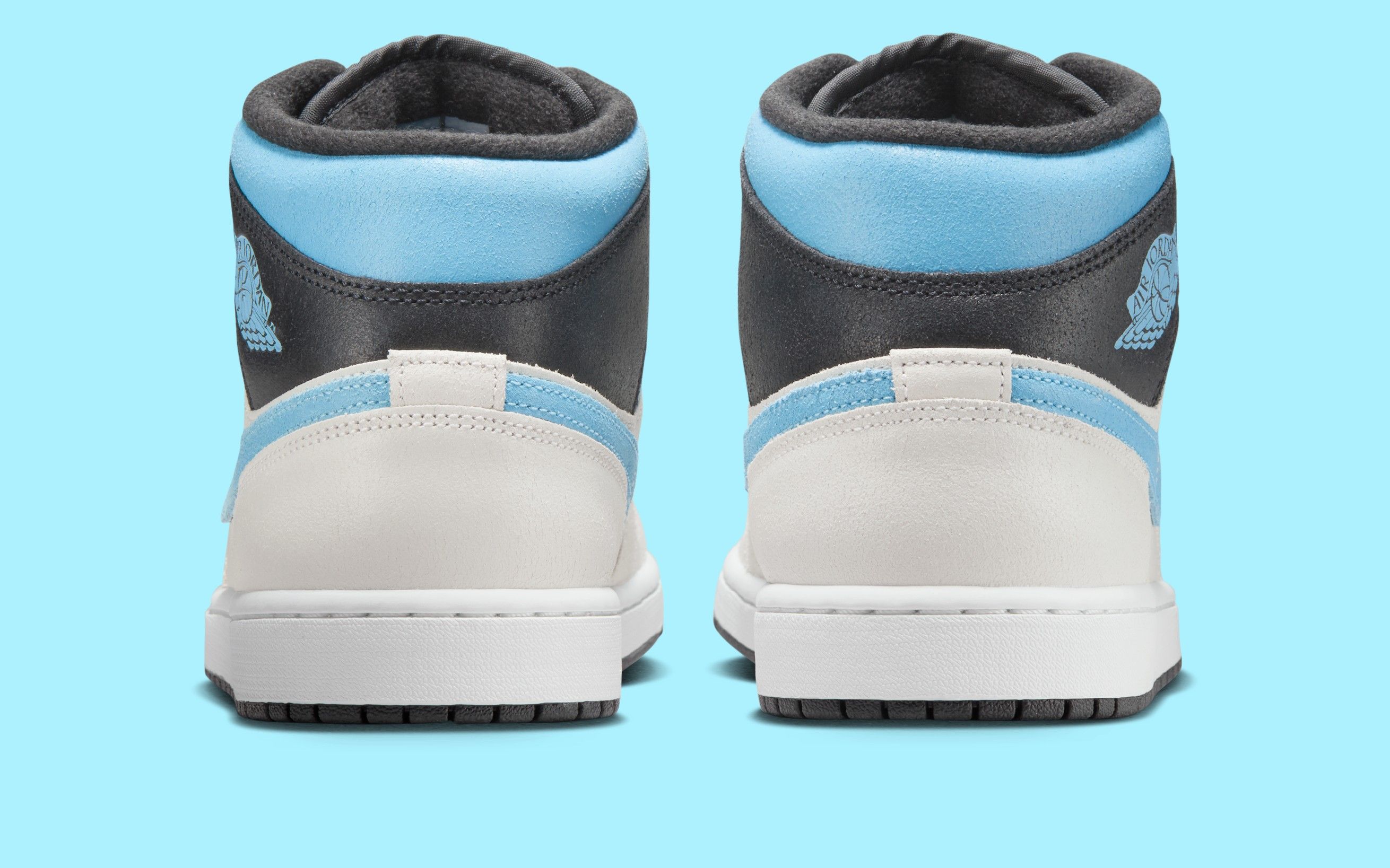 This release offers a refreshing mix of cool tones and premium textures, blending soft suede and leather across a clean white base. The signature Blue Chill hue takes over the overlays and Swoosh, contrasting against black collar panels and laces for balance. Additional details like the mini Swoosh on the forefoot and tonal Wings logo keep the design classic yet refined, while a crisp white midsole and black rubber outsole complete the look.