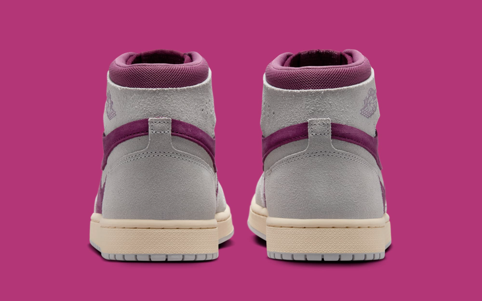 The Nike Air Jordan 1 CMFT 2 "Bordeaux and Grey" features a dominant grey suede upper that provides a sleek and versatile base. Accentuating this are the rich Bordeaux suede overlays on the mid-paneling and Swoosh, offering a vibrant contrast that catches the eye, as well as comfort through the Bordeaux breathable mesh alone the collar. This combination not only enhances the shoe's visual appeal but also emphasizes its luxurious feel.
