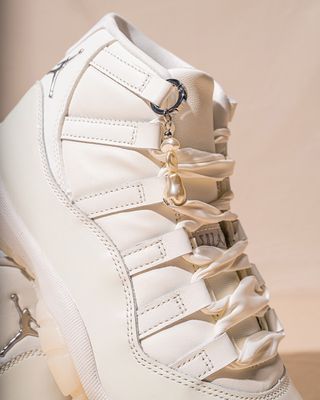 First looks highlight a "Sail" leather upper elevated with pearlescent detailing, delivering a finish that feels both timeless and refined. Wide ribbon laces add a touch of elegance, while a freshwater pearl keychain brings a bold, jewelry-inspired accent that further sets the pair apart from traditional editions of the silhouette.