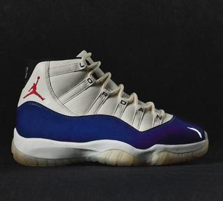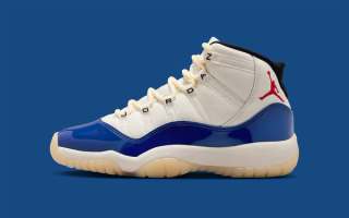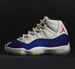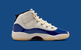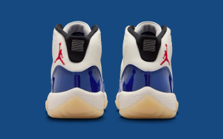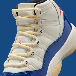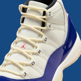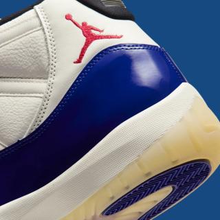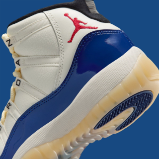 The AJ11 features a striking colorway combination of "Sail" atop the leather upper, "Deep Royal Blue" over the signature patent leather mudguards, and a striking pop of "Fire Red" rendering the ankle Jumpman motif. Finer details include "JORDAN" lettering across the eyestays akin to a retro sample and the 25th anniversary "Jubilee" release, with "Black" liners and "Muslin" tinted outsoles.