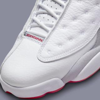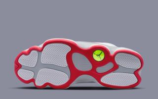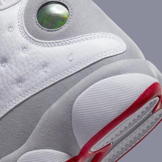 The brand new colorway hones in on bright whites, mid greys, and pops of True Red for a touch of Bulls flavor. Expect classic textiles, too, with lightly tumbled leather uppers and overlays and soft nubuck guards, with holographic cat eyes both at the ankle and underfoot — essentially, an alternate red version of the legendary 2005 Air Jordan 13 "Neutral Grey"