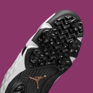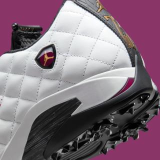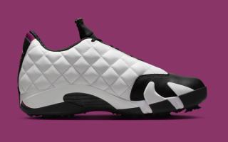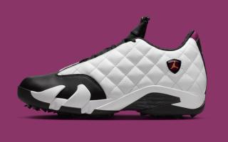 The pair joins an "Oxidized Green" style launched in February. Like its counterpart, the follow-up AJ14 for golf features a predominantly "White/Black" color scheme. The model's traditional perforated leather upper sees a quilted update that works in-tandem with glossy, race car-inspired details to bring Tinker Hatfield's design to life years after its debut. A wine-reminiscent hue, then, animates everything from the Ferrari-like Jumpman badge on the lateral profile, heel details, and other accents on the shoe. The detachable spikes complete the package in tonal "Black."