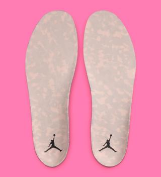 Adding a bolder element to the sneaker, vibrant hot pink highlights emerge on the backside of the tongue, the inner lining, and the tread underfoot. This striking color choice injects energy into the design, perfectly capturing the lively spirit of spring. The Air Jordan 8-inspired tongue dial and visible X-Plate underfoot, in a stark jet-black finish, provide a striking visual contrast, further elevating the shoe's overall aesthetic.