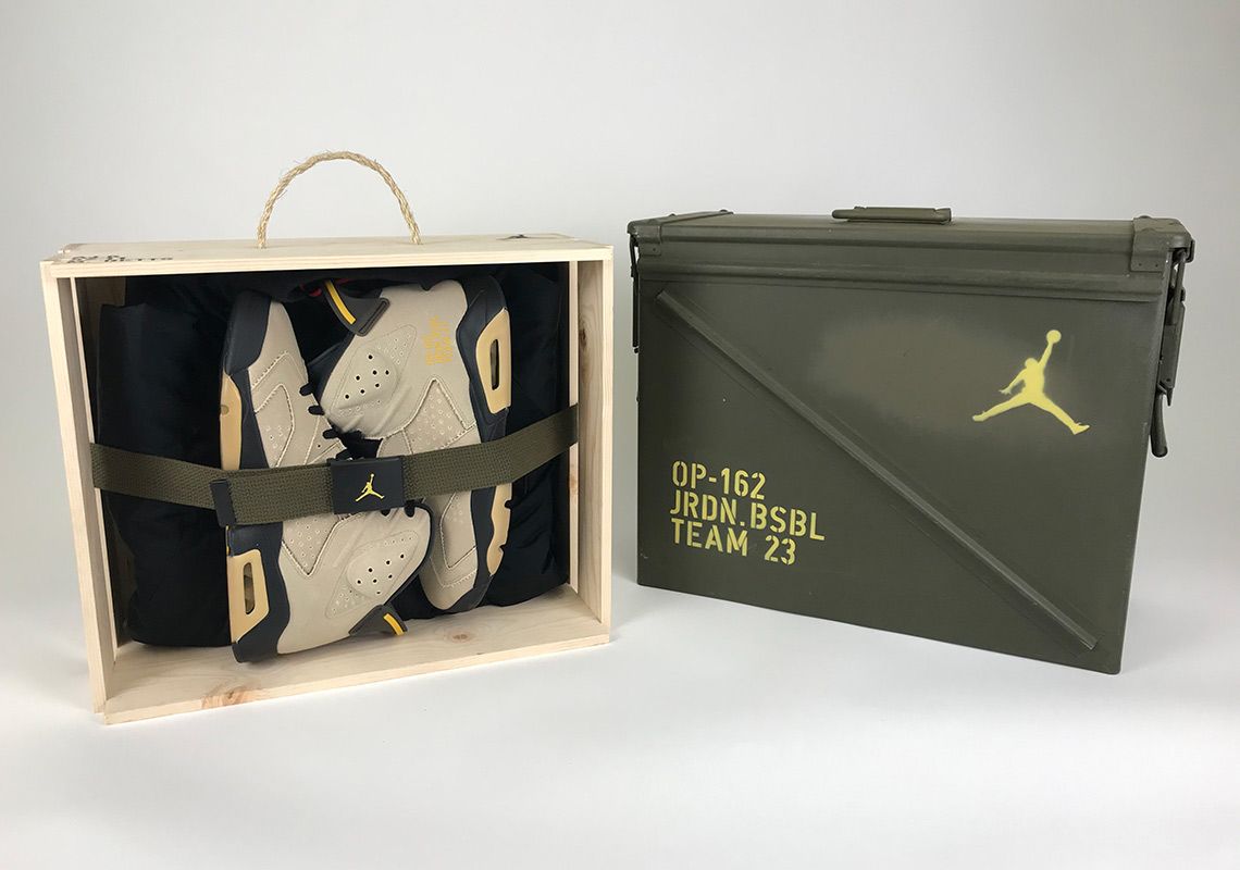If you’re following us closely on social media, yesterday you would have seen Dexter Fowler’s unboxing of the epic 1-of-11 Military-themed Air Jordan 6 PEs made especially for Jordan Brand‘s star MLB athletes. Today we get a closer look at the special edition pairing, along with its vintage-themed ammunition case packaging.