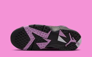 Rocking a smooth and lightly tumbled black leather, the pair relies upon contrast threadwork and pops of Barely Grape and Rush Fuchsia for character. It’s reminiscent of the Citrus 7s and Lakers 6s, albeit with a more feminine flair. Murdered-out midsoles and black neoprene tongues sit reserved for the aforementioned accents to shine, with outsoles trimmed with pops of white and purple, and liners of lavender rounding out the design.