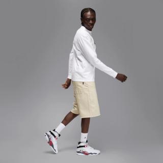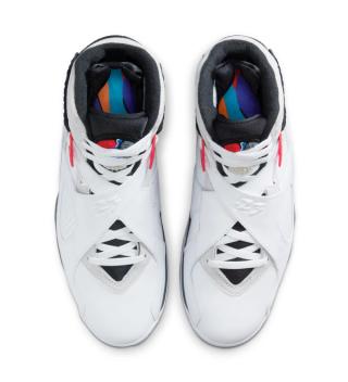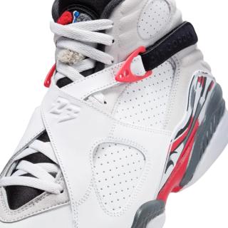 The Air Jordan 8 "Bugs Bunny," known for its classic Bulls-inspired White/Black/True Red colorway, stands out with its distinctive design elements. The shoe features crossing straps and a bold pattern on the heel guard, characteristic of Tinker Hatfield's design. This retro release pays homage to the shoe’s memorable appearances on both Bugs Bunny and Marvin The Martian in Nike's marketing campaigns.