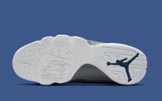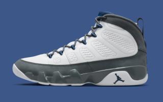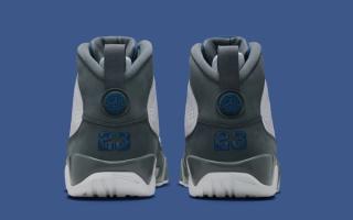 Adding contrast are a series of French Blue accents on the eyelets, tongue logos, heel tabs, and the lateral Jumpman branding—tying the look together with just the right amount of color. Underfoot, a white rubber outsole completes the look, complete with the Air Jordan 9’s signature details.